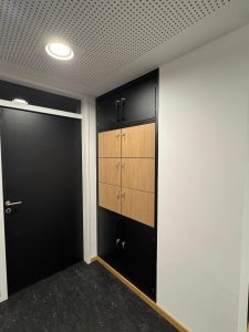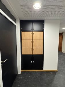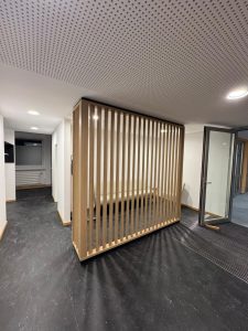 Die individuellen Sonderanfertigungen wurden in Kooperation mit PALMBERG Büroeinrichtungen + Service GmbH umgesetzt. Die Lamellenwand entstand in perfekter handwerklicher Ausführung durch eine regionale Schreinerei aus dem Landkreis Erding.